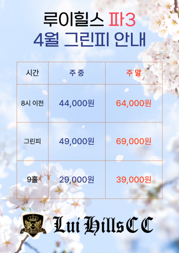 4월 그린피 안내 페이지 정보 작성자 관리자 댓글 0건 조회 1,867회 작성일 26-03-28 14:45 목록 본문 4월 그린피 안내 다음글3월 시즌 그린피 안내 26.03.14 댓글 0 댓글목록 등록된 댓글이 없습니다.